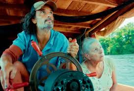 Feita essa ressalva, Mascaro nos traz mais uma ficção científica distópica, que, sem dúvida, dá contorno a incomodos bem presentes em nossos cotidianos. Na primeira, Divino Amor (2019) , filme estrelado, inclusive, pela atriz paraense Dira Paes, o diretor revelava um caminho assutador que as eleições daquele ano nos apontava com o recrudecimento da extrema direita, apoiada por um eleitorado influenciado pelo cristianismo evangélico, dizendo defender os valores de Deus, da pátria e da família. Mais uma vez, agora em O Último Azul (2025), Mascaro nos aponta precipícios para os quais vamos nos dirigindo enquanto sociedade, incapazes de imaginarmos novos futuros possíveis. O filme trata exatamente sobre o futuro. Se Divino Amor começa falando de um tempo no qual a principal festa nacional deixa de ser o Carnaval e passa a ser a da espera pelo Messias, O Último Azul, inicia com uma faixa, puxada por uma avião, na qual traz a mensagem “Futuro para todos”. Fala de um momento no qual idosos devem ser levados para colônias afastadas, onde isolados da sociedade, darão espaço para que os jovens da família não se preocupem com eles. Tratados como um bloco indiferenciado, como acontece sempre que se desumaniza um grupo social, recebem tratamento massificado (todos devem usar fraldas e receber uma mochila com os ítens que podem precisar na colônia ou no trajeto até lá). A administração burcrática dessa política pública é bem marcante e os cata velhos (carros de polícia destinados a não deixar que escapem) circulam por todos os lugares. Neste contexto é contada a história de Tereza, funcionária de um açougue especializado na carne e pele de jacaré (caça legalizada naquele futuro descrito). Ela descobre estar prestes a ser levada à colônia de idosos (lugar de condições desconhecidas para quem não chegou sua hora), pois o limite de idade para estar fora de tal espaço acabara de baixar de 80 para 75 anos. Na pressão que começa a se estabelecer em função desse prazo, a protagonista se percebe com desejos não realizados, como, por exemplo, o de voar de avião. Imbuída de realizar este feito antes de ser, compulsoriamente, retirada de sua rotina, acaba se jogando numa aventura nos rios e povoados amazônicos que vai fazê-la voar muito mais alto, como sujeito desejante. O que, para a administração pública, foi tido como fim do caminho, para Tereza, fora das câmaras frigoríficas e do trabalho de repetição, foi tempo de descobertas: das mais íntimas às mais compartilhadas com pessoas de seu território. Aprendeu a dirigir os barcos que a levaria rios afora, conheceu gente que a ajudou a buscar novas formas de olhar para fora, transformando seu mundo interno. Passamos o filme todo acompanhando leitos de rios de dimensões amazônicas, rios que, com certeza, uma hora chegarão ao mar, mas, que enquanto não chegam passeiam por entre matas e assistem nasceres e pores do sol lindíssimos! Nesses trajetos vamos nos deparando com a beleza da vida que é, justamente, não sabemos quando o rio da existência acabará, mas, por outro lado percebermos que enquanto há vida, há possibilidade de transformação de realidades, tanto internas quanto externas. Nada mais interessante ao sistema de manutenção do status quo que os futuros estejam inexoravelmente determinados e, junto com estes acimentamento de margens, que novos futuros não possam ser sonhados e outras possibilidades de vida experimentadas. Mas, Tereza nos faz sair da sala de cinema certos de que todo controle não passa de ilusão e de que a velhice não é tempo de predomínio de Thanatos… pelo menos não o é para quem se permitem seguir, banhado por Eros, sonhando com novos voos!